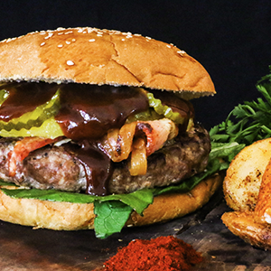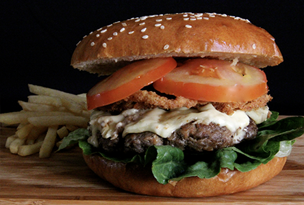 Disfruta de nuestra deliciosa combinación de carne preparada en casa, acompañada de queso mozzarella y manchego, crujientes aros de cebolla, mayonesa de jalapeño, tomate, lechuga y mayonesa de BBQ.