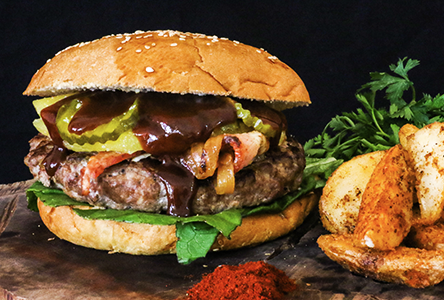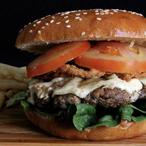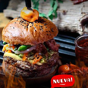 Jugosita carne preparada en casa, acompañada de queso manchego, tocino, cebolla caramelizada, salsa BBQ, pepinillos, piña, lechuga y un toque de mayonesa.